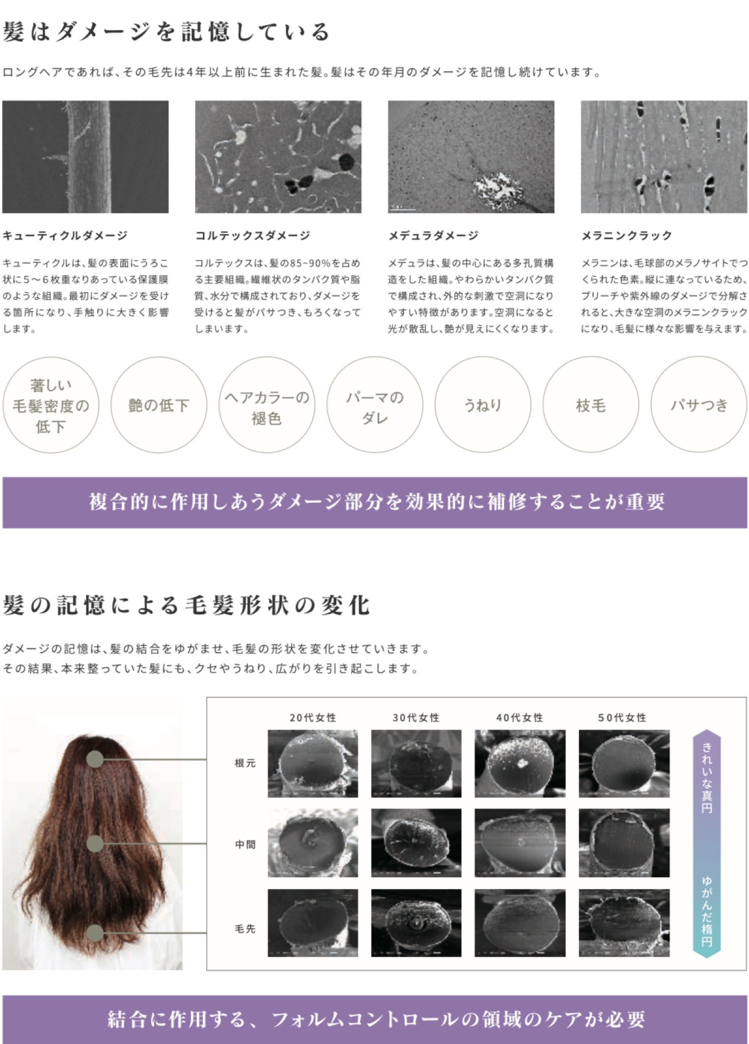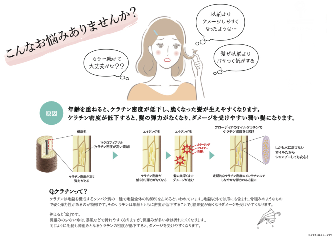 ◇髪の毛はというと年齢に応じて髪の中が空洞化やケラチン(髪の主成分)密度が低くなり、毛髪内部構造のバランスが崩れて毛髪が親水性に傾き脆い状態になります。