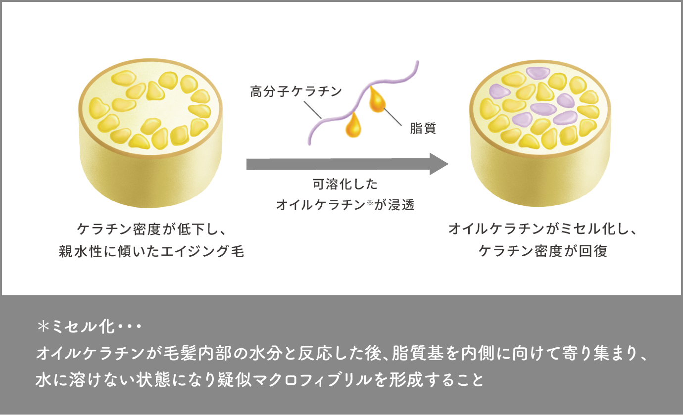 エイジング毛に多く見られるケラチン密度の低下している部分に作用する『ミセルショット』エイジング毛に馴染みやすく、浸透性をアップさせるため、可容化したオイルケラチン。毛髪内部のすみずみまで浸透した後、ミセル化することで、✳︎マクロフィブリルを再現し、エイジング毛にケラチン密度を取り戻します。