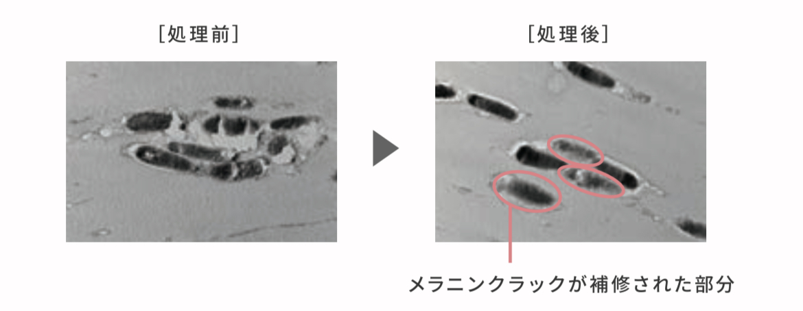 化学処理や紫外線などのダメージにより空洞化した部分にだけ反応して、補修成分をケアバルーンで内包するバルネイドシステム。この技術で補修成分が流出しやすかった大きな空洞にもバルーン状に定着することで、高い補修効果を発揮します。