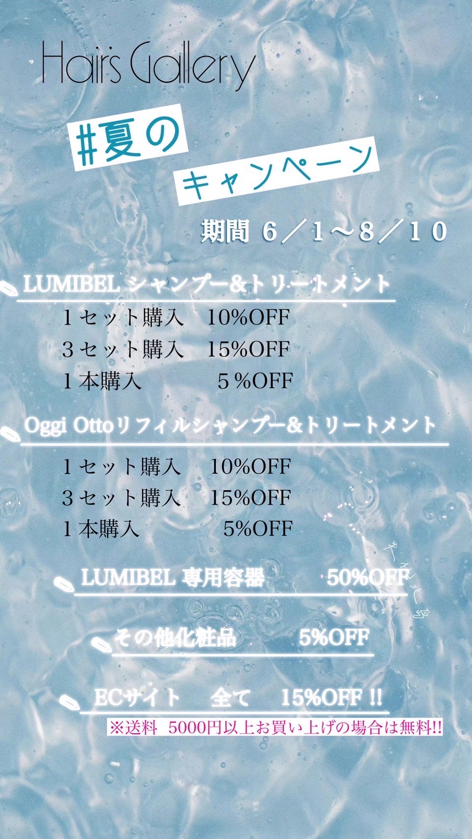 2024/6/6 2024年サマーシャンプーキャンペーン Salon | Hair'sGallery 難波店 Categories | お知らせ いつもヘアーズギャラリーをご愛顧いただき誠にありがとうございます。この度6月1日〜8月10日までシャンプー、トリートメントを含むヘアケア商品がお得にお求めできるキャンペーンをおこなっております。 スタッフがお客様にあったホームケアのアイテムをご紹介させていただきます。 是非この機会をご利用下さい。